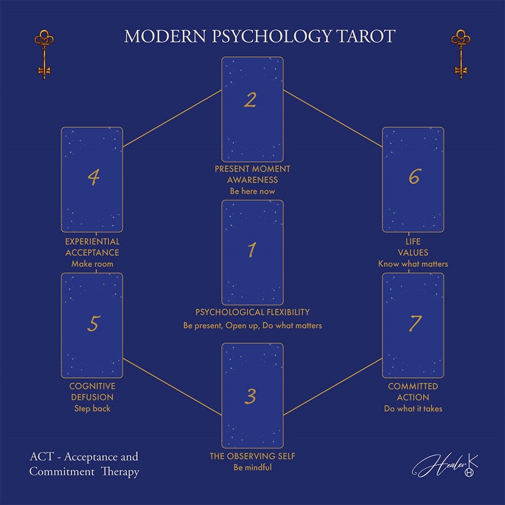 The print on the table cloth includes 7 card positions, ACT, Acceptance and Commitment Therapy, hexaflex keywords (experiential acceptance/make room, cognitive defusion/step back, present moment awareness/be here now, the observing self/be mindful, life values/know what matters, committed action/do what it takes, psychological flexibility/be present-open up-do what matters).