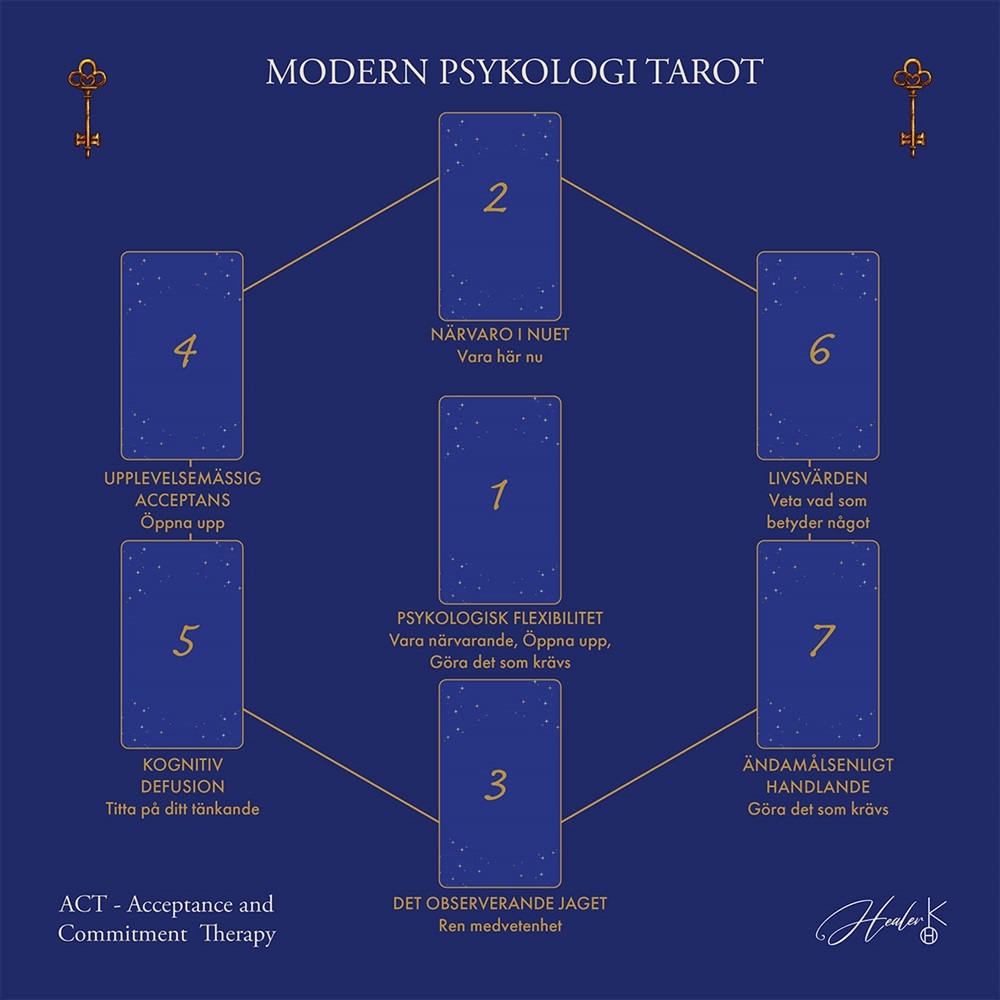 Tarotduk 58 cm x 58 cm - textil - Modern Psykologi Tarot - Svensk text. Trycket på duken inkluderar 7 kortpositioner, ACT, Acceptance and Commitment Therapy, hexaflex nyckelord (upplevelsemässig acceptans, kognitiv defusion, närvaro i nuet, det observerande jaget, livsvärden, ändamålsenligt handlande, psykologisk flexibilitet).
